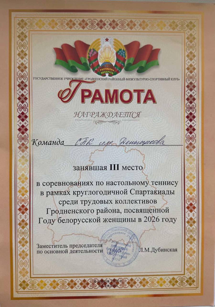 Члены СПК имени Деньщикова приняли активное участие в соревнованиях по настольному теннису в рамках круглогодичной спартакиады среди трудовых коллективов Гродненского района. Мероприятие было посвящено